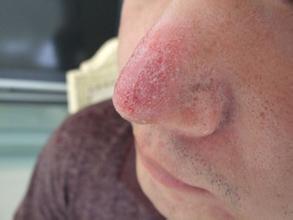 3.鼻赘期:由于长期充血,反复感染,鼻部结缔组织增殖、皮脂腺异常增大,形成大小不等的隆起性结节,导致鼻尖部外观肥大,畸形如赘生物。鼻赘表面可见明显扩大的皮脂腺口,挤压时有条状白色粘稠皮脂溢出。严重的鼻赘多见于40岁以上的男性。